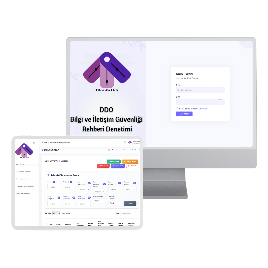 Bu vizyonla geliştirilen Adjuster-KVKK, kişisel veri işleme süreçlerinin tamamını dijital ortama taşıyarak; veri envanteri oluşturma, açık rıza süreçlerini yönetme, risk ve denetim izleme, düzeltici faaliyet planlama gibi tüm kritik adımları tek platformda bir araya getirir. Esnek yapısı ve özelleştirilebilir modülleri sayesinde, farklı sektörlerden kurumların ihtiyaçlarına uyum sağlar. Amacımız; kurumlara yalnızca yazılım sunmak değil, veri güvenliği kültürünü içselleştirmelerine yardımcı olan sürdürülebilir bir uyum altyapısı inşa etmektir.